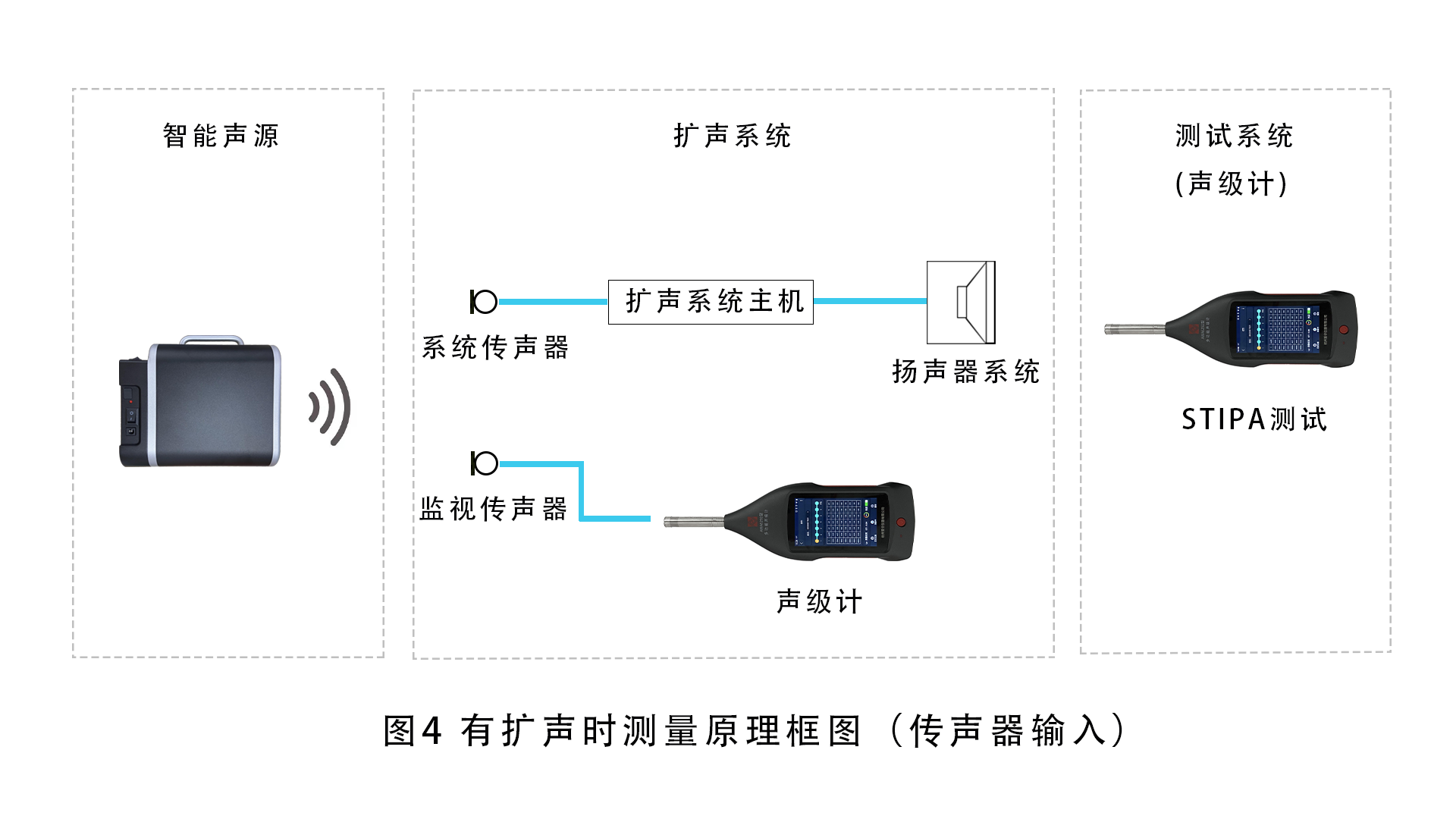對于那些需要使用擴聲傳聲器講話或播音,再通過擴聲系統播放的場所,測試信號由智能聲源對著系統傳聲器發聲。測試聲源應置于正常說話距離,傳聲器的軸線指向正常發話方向;測試信號級與正常說話聲壓級相當,在距離聲源0.5 m處聲壓級為66 dBA。在傳聲器輸入處可用聲級計監測該聲壓級以及測試信號頻譜。測試聲信號經擴聲系統由揚聲器系統播放,利用聲級計可以按相關標準要求測量擴聲系統和聲學場所的各項指標。